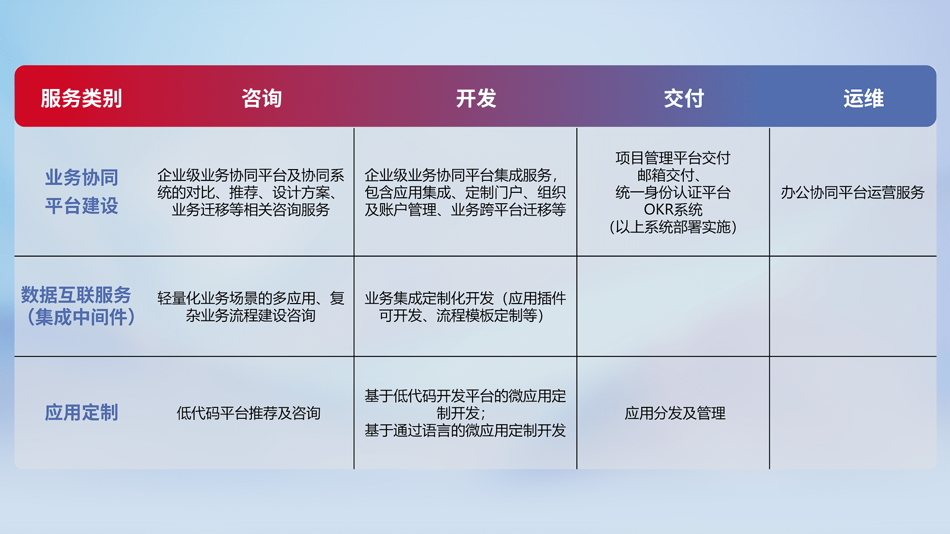 针对钉钉、、企微、、、IDaas等平台级产品提供产品的规划、、、、方案、、、、交付、、、、定制化开发等服务,,实现如统一协同办公、、、智能客户服务、、、混合会议管理、、、、智能数据查询、、等业务场景,,,实现数字化转型。。