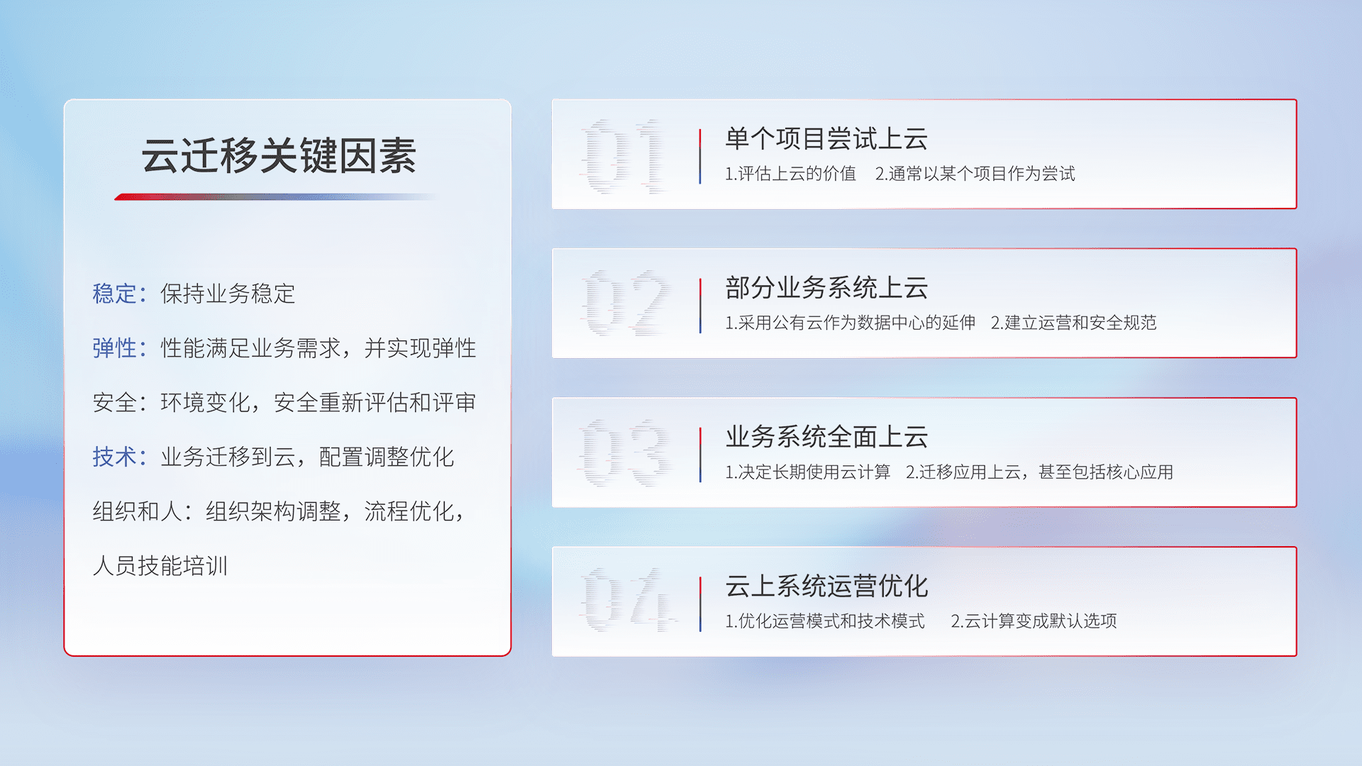 结合实际业务,,,,从规划设计、、、云平台选型、、、云原生改造、、、数据迁移、、、、集成交付,,迁移全过程为客户识别最佳上云路径,,,,做好风险识别管理,,设计网络架构、、、身份权限、、安全审计合规、、、、操作审计、、、日志审计、、、、监控告警策略、、、多站点容灾设计等,,,,对云上基础设施进行整体规划,,提升IT治理水平,,,,以满足弹性、、高可用、、高性能的需求。。