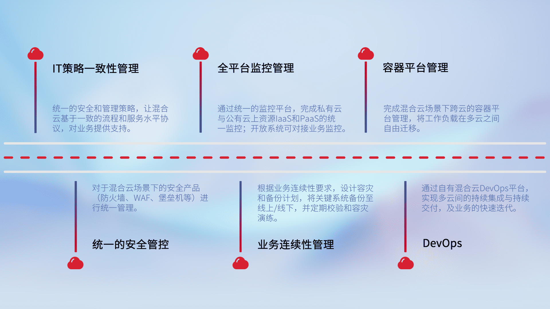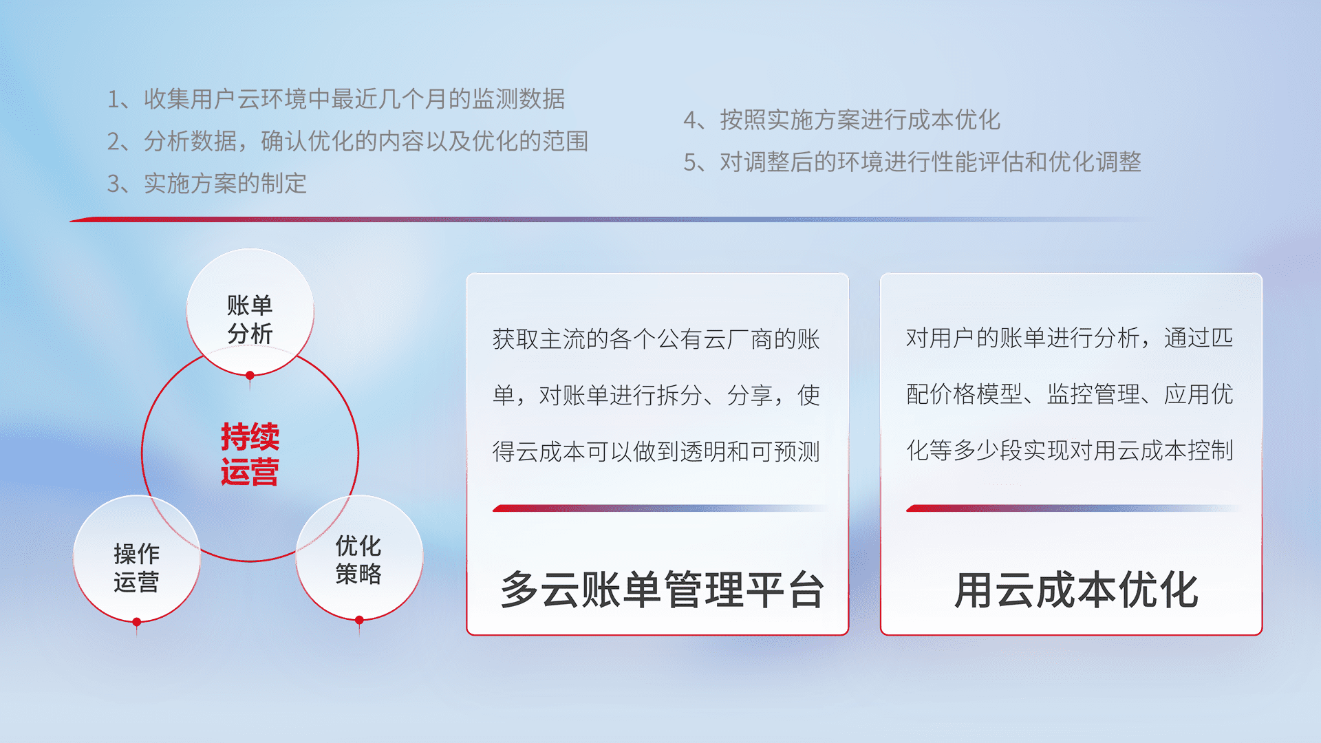 通过多云纳管,,,以统一的资源数据模型把客户的云资源进行抽象和封装,,,进而实现对多云资源的统一操作,,,,保障云资源管理的可靠性、、、稳定性与可用性。。。。量身定制化运维内容,,,,配置、、开发运维、、补丁管理、、、、备份、、、、监控、、、、认证和访问管理、、、审计和日常巡检等,,,,保障在用云过程中的可靠度,,,,稳定度以及高可用率。。